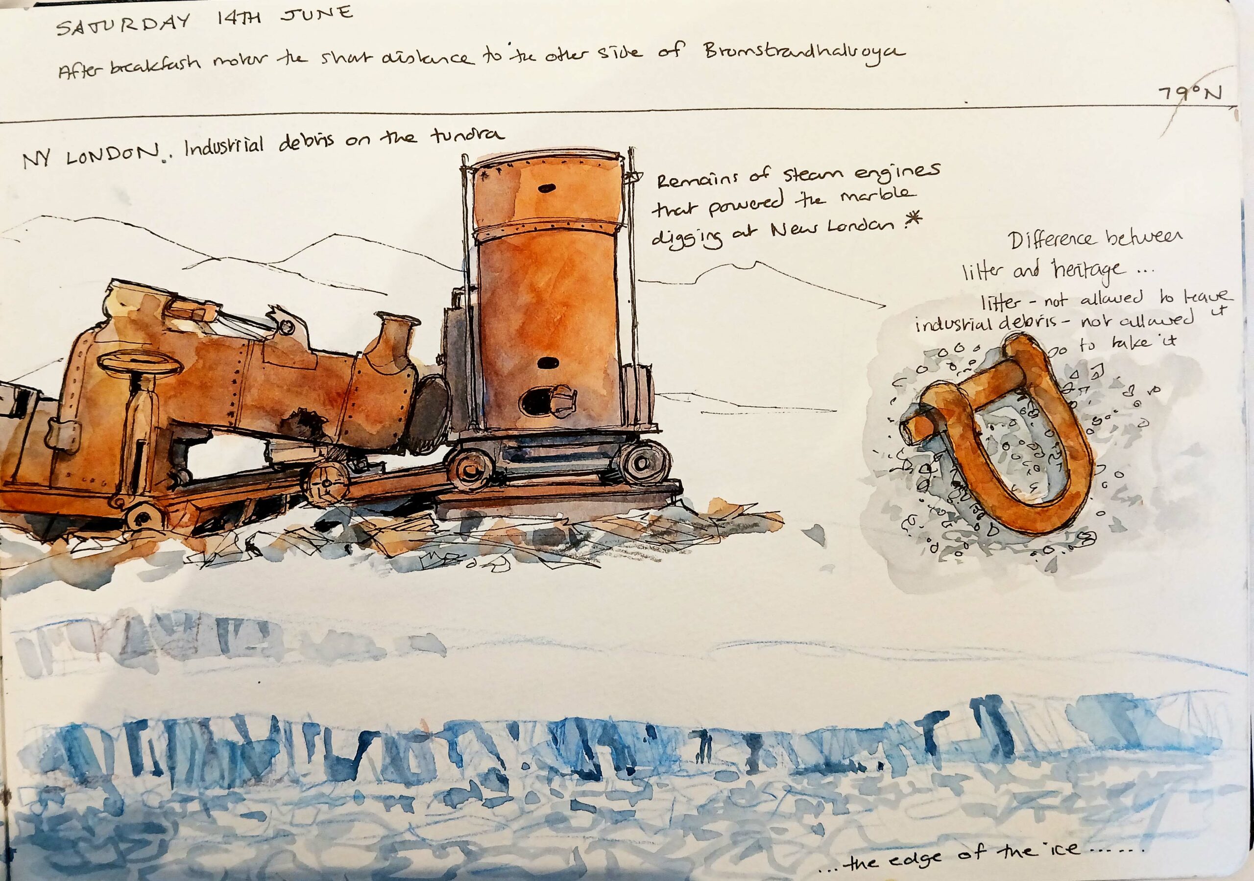 Our ship was the gaff schooner Noorderlicht, 34 metres of steel, rope and canvas. What a treat to be sailing these icy waters, anchored at the crumpled edge of a glacier, sketching a heap of walruses dozing on the beach, wandering round the remains of old mining works in settlements now housing multi-national research scientists. We were well looked after by the crew, who were a mix of Dutch, Norwegian, Russian, German, Sicilian and British. Our guides were patient as we got the hang of snow shoes, telling us all about the history, wildlife and flora, keeping polar bear watch as we sat and sketched. Later, under sail, we had time to work on our sketchbook pages in the spacious and warm saloon or enjoying a gin and tonic on deck chilled with glacier ice.