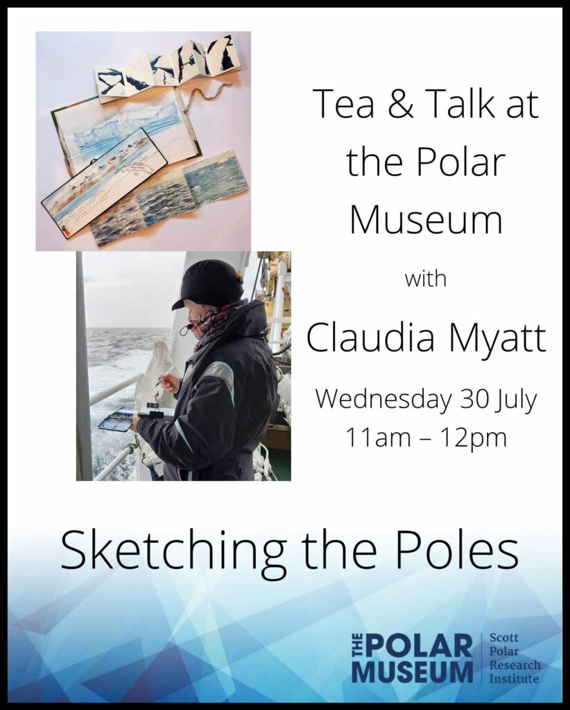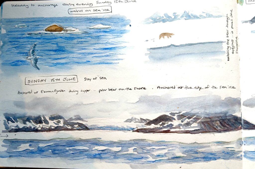 Then at the end of the month I’m back at the Scott Polar Research Institute in Cambridge where the ‘Painting the Poles’ exhibition is still running. On 30th July I’ll be doing a talk and then a workshop on all things polar sketching, so join me for both or either – all free! Details here: https://www.spri.cam.ac.uk/museum/events/