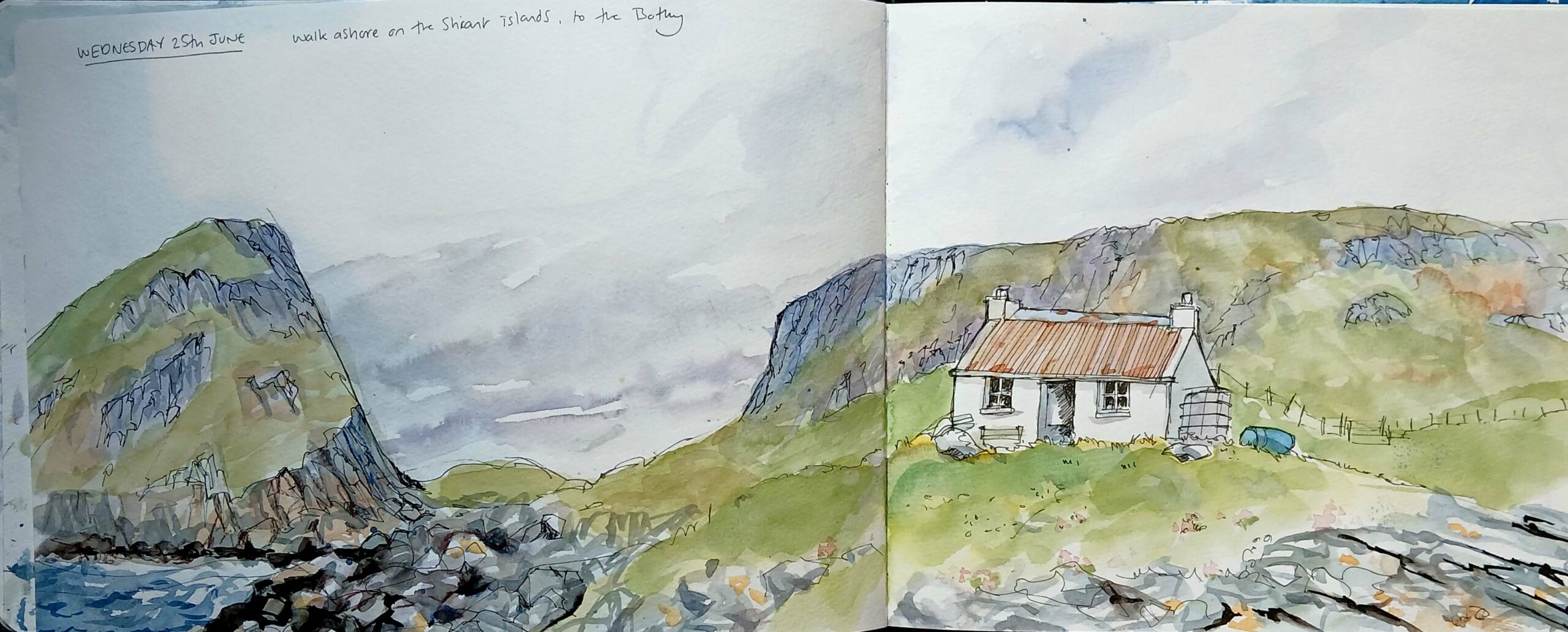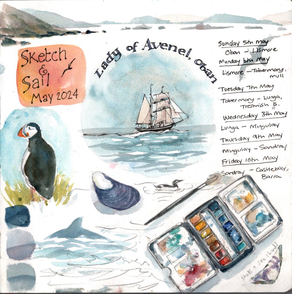 The ship is ‘Lady of Avenel’ and she’s a home from home for me as she hosts our Sketch and Sail holidays. So when it rains, the artists have a happy time snug in the cabin working on our sketches; on a Sessions and Sail trip we had just as happy a time learning tunes, helped by excellent tutors Harry Bird and Tamsin Elliot.