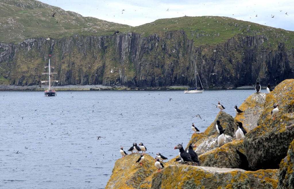 Getting home from Svalbard in mid-June, there was barely time to wash a few clothes before it was time to head north again. Not so far, only to Scotland but a two day train journey. I needed pretty much the same clothing as I did for the Arctic – sea boots, oilskins, warm jumpers and woolly hat. This was my holiday, sailing with musicians instead of artists, on a brigantine instead of a schooner. ‘Sessions and Sail’ is the inspired idea of Shetland musician Barry Nisbet who is a highly skilled tall ships captain as well as top class musician. The weather was not kind; apparently high pressure in the south squeezes the low pressure systems in the north and makes them wetter and meaner. But the Hebrides have their own magic in any weather and the highlight of the trip was a trip to the isolated Shiant Islands where we anchored in bright sunshine in a cloud of puffins and guillemots beneath the high cliffs.